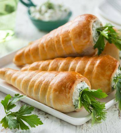 5. Kurz vor dem Servieren die Blätterteig-Karotten mit dem Kräutertopfen füllen und Petersilie oder andere Kräuter als Karottengrün in die oberen Enden stecken.